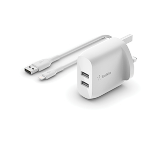Dual USB-A Wall Charger w/ 1M PVC A-LTG, 24W, WHT