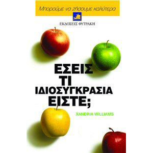 ΕΣΕΙΣ ΤΙ ΙΔΙΟΣΥΓΚΡΑΣΙΑ ΕΙΣΤΕ; XANDRIA WILLIAMS Ένας κατατοπιστικός οδηγός, μέσα από τον οποίο μπορείτε να ανακαλύψετε τις δυνατότητες αλλά και τις αδυναμίες σας και να εξε τάσετε πόσο ταιριάζετε με τους ανθρώπους που σας περιβάλλουν. Από την εποχή των αρχαίων Ελλήνων ήδη ήταν γνωστό ότι υπάρχουν τέσσερις κύριοι τύποι προσωπικότητας -οι ιδιοσυγκρασίες- θεωρία που εξακολουθεί να αποτελεί τη βάση της σύγχρονης ψυχολογίας. Γνωρίστε, λοιπόν, τη δική σας ιδιοσυγκρασία και θα κατανοήσετε πώς επηρεάζε ι κάθε σφαίρα της ζωής σας. Εσείς, τι ιδιοσυγκρασία είστε; - Ο δυνατός, αισιόδοξος χολερικός; - Ο δημιουργικός, ευφάνταστος αιματώδης; - Ο συνετός, αξιόπιστος φλεγματικ ός; - Ο στοργικός, ευαίσθητος μελαγχολικός; Με την ανάλυση των τεσσάρων τύπων προσωπικότητας, η Xandria Williams σας βοηθά να βρείτε τον πραγματικό σας εαυτό, προσφέροντάς σ ας έτσι το "κλειδί" για τον έρωτα, την υγεία και την ευτυχία.Prices, Promotions, Specifications, Availability and Offers may change without any notice. Pricing, typographic, or photographic errors may occur.