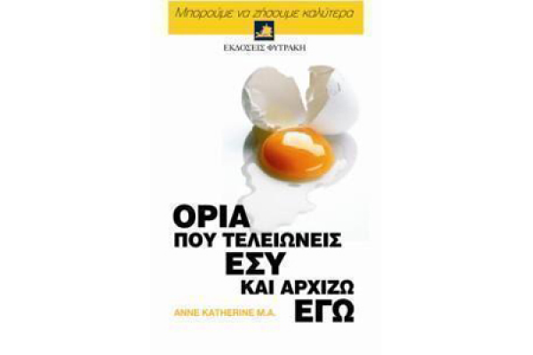 ΟΡΙΑ: ΠΟΥ ΤΕΛΕΙΩΝΕΙΣ ΕΣΥ ΚΑΙ ΑΡΧΙΖΩ ΕΓΩ ANNE CATHERINE "Οι καλοί φράχτες κάνουν τους καλούς γείτονες". Τίποτα πιο συχνό από την παραβίαση των ορίων. Ο ψυχαναλυτής σάς προτεί νει να πάτε για καφέ... μετά τη συνεδρία. Το αφεντικό σας θέλει να εντρυφήσει σε λεπτομέρειες της προσωπικής σας ζωής, ο προϊστάμενος σάς αποχαιρετά δήθεν φιλικά με έ να χτύπημα στα οπίσθια... και ούτω καθεξής! Βάλτε όρια και προφυλάξτε την πνευματική και τη σωματική σας υγεία. Διαβάστε πραγματικές ιστορίες που διηγούνται τα αρνητ ικά αποτελέσματα που φέρνει η έλλειψη ορίων. Προστατέψτε τα ατομικά σας όρια και σεβαστείτε και τα όρια των άλλων.Prices, Promotions, Specifications, Availability and Offers may change without any notice. Pricing, typographic, or photographic errors may occur.