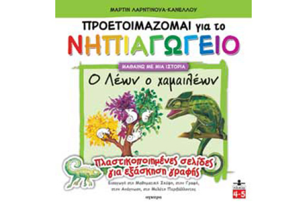 Ο ΛΕΩΝ Ο ΧΑΜΕΛΕΩΝ Συγγραφέας: ΜΑΡΤΙΝ ΛΑΡΝΤΙΝΟΥΑ-ΚΑΝΕΛΛΟΥ Ηλικίες: 4+ Σελίδες: 16 Με πλαστικοποιημένες σελίδες για εξάσκηση γραφής Αυτό το βιβλίο ανήκει σε μια νέα σε ιρά παιδικών βιβλίων που στόχο έχει να προετοιμάσει τα μικρά παιδιά για το νηπιαγωγείο. Μέσα από τη μεγάλη τους αγάπη για τα ζώα, τα παιδιά εκδηλώνουν ενδιαφέρον για τη μάθηση. Εμείς τους την παρέχουμε προάγοντας την αναζήτηση, την αιτιολόγηση, την κριτική τους σκέψη, τη λήψη αποφάσεων και τη λύση προβλημάτων. Με την ιστορία αυτή δίνουμε την ευκαιρία στα παιδιά να χρησιμοποιούν τις γνώσεις τους, να εξασκούν τις δεξιότητές τους και να συνεχίζουν να μαθαίνουν διαρκώς. Οι δραστηριότητες που πρ οτείνουμε δεν είναι μια σειρά αποσπασματικών και απομονωμένων εργασιών χωρίς νόημα για τα παιδιά, αλλά ούτε και εξαντλητικές επαναλήψεις. Αντιθέτως, σε κάθε ιστορί α, οι εργασίες είναι έτσι μελετημένες ώστε να ανταποκρίνονται στις ικανότητες και στις ανάγκες των παιδιών ανά ηλικία, έτσι: • Η πορτοκαλί σειρά απευθύνεται σε παιδ ιά 3-4 ετών. • Η πράσινη σειρά απευθύνεται σε παιδιά 4-5 ετών.